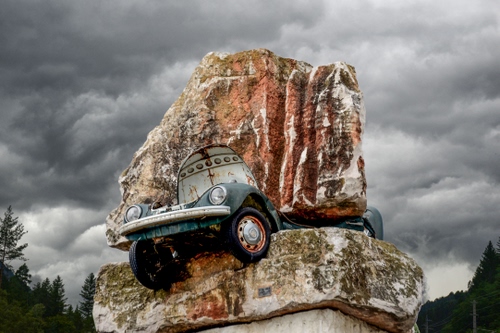 L'installazione qui raffigurata è un'opera di tale artista Antonio Paradiso, è intitolata Mausoleo ad Icaro, ed è stata realizzata con massi di pietra di Trani e maggiolino sia a Molfetta che a Matera. I massi ed il maggiolino sono diversi nelle due installazioni ma l'idea e l'autore è lo stesso. Per info digitare Mausoleo ad Icaro su google.