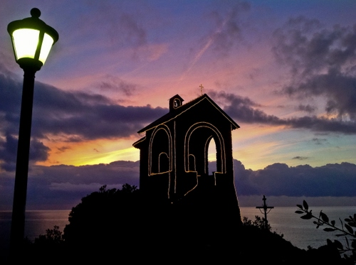 Tag: lampione, tramonto, mare, chiesa, chiesetta, nuvole, controluce, luci, silhouette, nero.