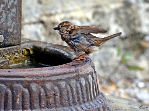 Passerotto che si scrolla le penne dopo essersi fatto il bagno
