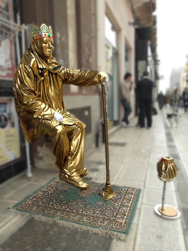 interessante l'idea di rendere tutto sfocato tranne l'artista di strada e il tappeto, l'immagine risulta molto gradevole