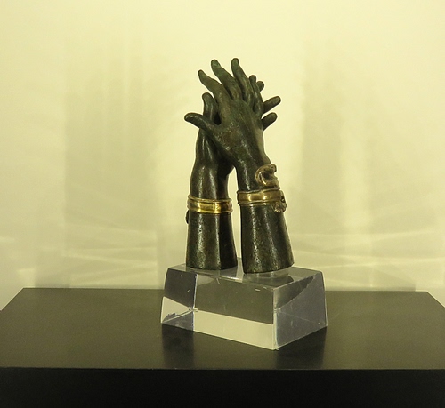 Avambracci femminili con mani congiunte, provviste all'interno di una cerniera che ne consente la reale funzione, al di sotto dei polsi, bracciali in lamina aurea a spirale con terminali a testa di serpente