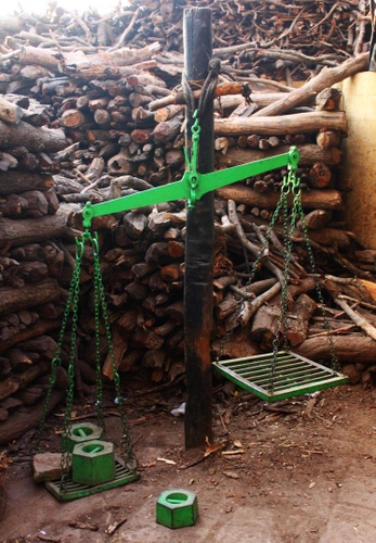 Catasta di legna per cremazione a Varanasi (India). In primo piano una bilancia per la pesatura della legna stessa.