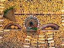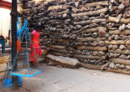 Catasta di legna per cremazione a Varanasi (India). In primo piano una bilancia per la pesatura della legna stessa.