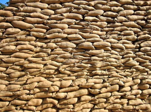 L'angolino l'ho lasciato volutamente per far vedere che di una catasta si tratta, altrimenti potrebbe anche sembrare una distesa di sacchi in orizzontale. Certamente un'inquadratura più ampia con più cielo avrebbe avuto una resa migliore, ma questa è una vecchia foto che avevo fatto proprio per evidenziare i sacchi di sabbia, senza pensare ad alcuna possibilità di futura utilizzazione.