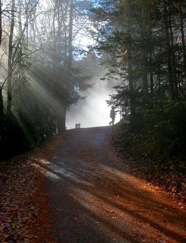 Tutto merito dei raggi solari che, annientando la nebbia e filtrando prepotenti tra gli alberi lungo il sentiero, gli hanno donato questa luce permettendomi di realizzare la foto.