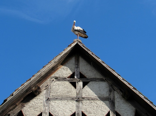 Tag: cielo, tetto, azzurro, uccello, cicogna, legno, triangolo, tegole, piume, travi, casa, animale, quadrati.
