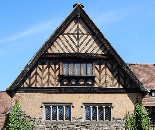 Tag: finestre, triangolo, casa, tetto, cielo, azzurro, edera, verde, legno, vetri, colonnine, abbaino, piante, alberi, colonne, graticcio.