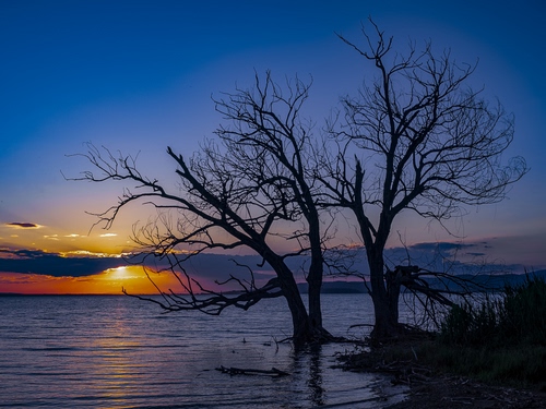 Tag: tramonto, alberi, nuvole, cielo, acqua, sole, lago, rami, controluce, albero, mare, riflessi, alba.