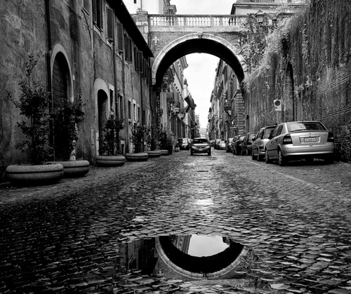Tag: bianconero, strada, riflesso, arco, pozzanghera, auto, piante, ponte, automobili, acqua, via, vasi, balaustra, grigio, porte, scorcio, case, archi.