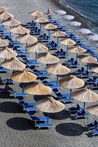 Tag: ombrelloni, spiaggia, mare, paglia, lettini, sabbia, ombre, blu, acqua, file, sdraio, azzurro, tela, bianco, fila, cerchi, righe.