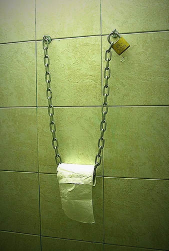 Tag: lucchetto, catena, carta, piastrelle, bagno, rotolo, bianco, verde, anelli, ganci, mattonelle, igienica, ferro, oro, stranezze.