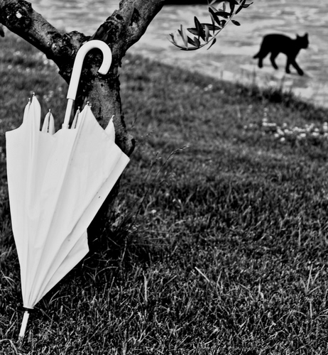 Apprezzo particolarmente le foto istantanee, dove il fotografo riesce a cogliere attimo, qui hai dato anche all'immagine un buon taglio, creando una contrapposizione fra il bianco dell'ombrello e il nero del gatto. Validissima per davvero, per me da prime 20 come minimo. |