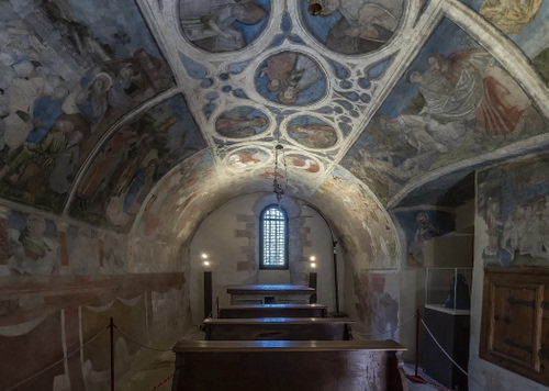 Tag: affreschi, finestra, cappella, chiesa, arco, banchi, volta, luci, altare, panche, dipinti, cripta, interno.