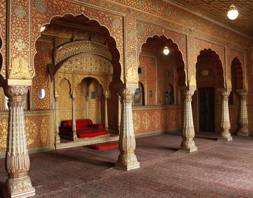 Archi in una sala interna del palazzo dei maharaja a Samode (India).