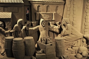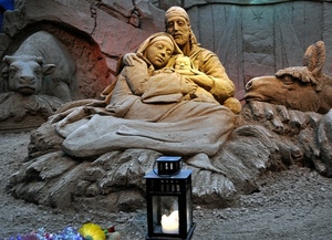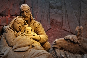 Bepi e Maria cun Gjesùbambin, il toru e il mùs a stàn a cjalàiu.