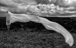tanto per far capire il mio punto di vista... su questo sito io cerco di attenermi scrupolosamente ad argomenti strettamente fotografici (magari con qualche intrusione nel faceto): quando incappo in una foto che mi colpisce lascio il mio pensiero. a volte lo faccio perché è l'immagine in sé che mi colpisce, a volte perché mi colpisce la discussione che nasce sotto alla foto stessa. qui l'interesse nasce dalla foto, una grande foto, tutto quello che non è invece un'altra immagine della medesima autrice. qui c'è uno splendido bianconero contrastato che fornisce un background drammatico che ben si adatta al soggetto che lascio per ultimo per passare ad altri elementi. la composizione è ineccepibile, il frame è diviso orizzontalmente in tre zone tra cielo e diverse tipologie di terreno. a rompere l'eccessiva precisione di questa disposizione c'è la posizione decentrata, quasi fuori dai canoni, del punctum (sì, anche qui secondo me c'è un punctum...) e la scansione vagamente diagonale del velo (lo spectrum). not to forget il bellissimo mosso dell'estremità del velo... poi veniamo alla chicca, il punctum, ciò che dà a questa immagine un deciso valore aggiunto: la figura umana. perché? per il velo che la ricopre, che la rende misteriosa, che fa sorgere pensieri sul perché e sul percome e che, a conti fatti, regala un tono surreale al risultato finale. chi è interessato può confrontare questa immagine con l'altra cui faccio riferimento visitando questo URL: http://www.dizy.com/it/foto/762836001