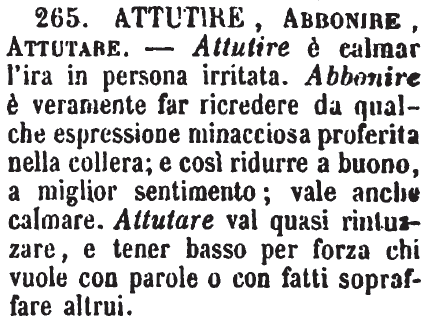 | Attutire, Abbonire, Attutare - Attutire è calmar l'ira in persona irritata. Abbonire è veramente far ricredere da qualche espressione minacciosa proferita nella collera; e così ridurre a buono, a miglior sentimento; vale anche calmare. Attutare val quasi rintuzzare, e tener basso per forza chi vuole con parole o con fatti sopraffare altrui. [immagine] |