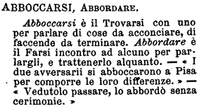 | Abboccarsi, Abbordare - Abboccarsi è il Trovarsi con uno per parlare di cose da acconciare, di faccende da terminare. Abbordare è il Farsi incontro ad alcuno per parlargli, e trattenerlo alquanto. - «I due avversarii si abboccarono a Pisa per comporre le loro differenze.» - «Vedutolo passare, lo abbordò senza cerimonie.» [immagine] |