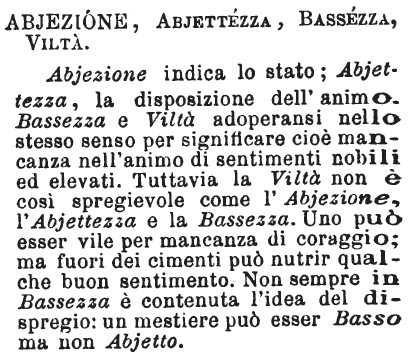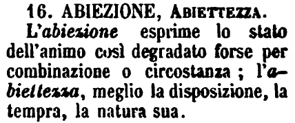 | Abiezione, Abiettezza - L'abiezione esprime lo stato dell'animo così degradato forse per combinazione o circostanza; l'abiettezza, meglio la disposizione, la tempra, la natura sua. [immagine] |