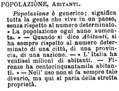 Popolazione, Abitanti - Popolazione è generico; significa tutta la gente che vive in un paese, senza rispetto al numero determinato. «La popolazione ogni anno aumenta.» - Quando si dice Abitanti, si ha sempre rispetto al numero determinato di una città, di una provincia, di una nazione. -
