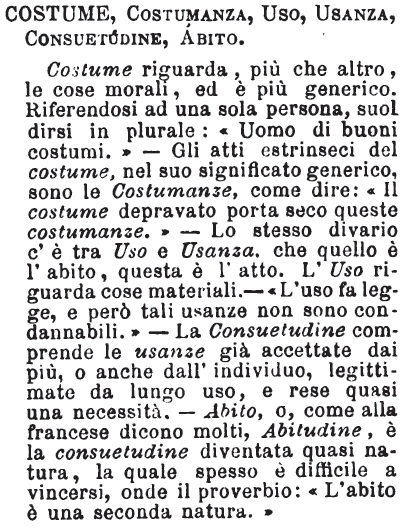 Costume, Costumanza, Uso, Usanza, Consuetudine, Abito - Costume riguarda, più che altro, le cose morali, ed è più generico. Riferendosi ad una sola persona, suol dirsi in plurale: «Uomo di buoni costumi.» - Gli atti estrinseci del costume, nel suo significato generico, sono le Costumanze, come dire: «Il costume depravato porta seco queste costumanze.» - Lo stesso divario c'è tra Uso e Usanza, che quello è l'abito, questa è l'atto. L'Uso riguarda cose materiali. - «L'uso fa legge, e però tali usanze non sono condannabili.» - La Consuetudine comprende le usanze già accettate dai più, o anche dall'individuo, legittimate da lungo uso, e rese quasi una necessità. - Abito, o, come alla francese dicono molti, Abitudine, è la consuetudine diventata quasi natura, la quale spesso è difficile a vincersi, onde il proverbio: «L'abito è una seconda natura.» [immagine]