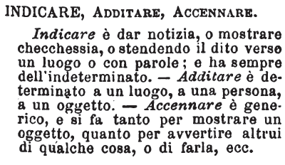 Indicare, Additare, Accennare - Indicare è dar notizia, o mostrare checchessia, o stendendo il dito verso un luogo o con parole; e ha sempre dell'indeterminato. - Additare è determinato a un luogo, a una persona, a un oggetto. - Accennare è generico, e si fa tanto per mostrare un oggetto , quanto per avvertire altrui di qualche cosa, o di farla, ecc. [immagine]