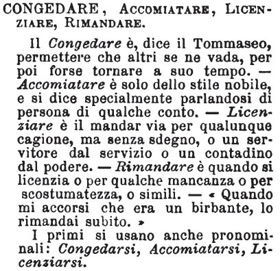 | Congedare, Accomiatare, Licenziare, Rimandare - Il Congedare è, dice il Tommaseo, permettere che altri se ne vada, per poi forse tornare a suo tempo. - Accomiatare è solo dello stile nobile, e si dice specialmente parlandosi di persona di qualche conto. - Licenziare è il mandar via per qualunque cagione, ma senza sdegno, o un servitore dal servizio o un contadino dal podere. - Rimandare è quando si licenzia o per qualche mancanza o per scostumatezza, o simili. - « Quando mi accorsi che era un birbante, lo rimandai subito. »