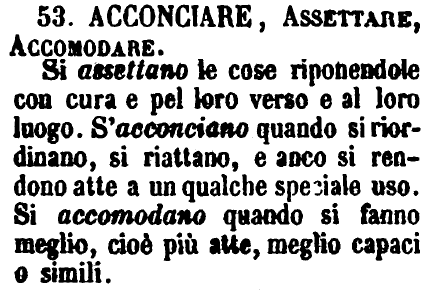 Acconciare, Assettare, Accomodare - Si assettano le cose riponendole con cura e pel loro verso e al loro luogo. S'acconciano quando si riordinano, si riattano, e anco si rendono atte a un qualche speciale uso. Si accomodano quando si fanno meglio, cioè più atte, meglio capaci o simili. [immagine]