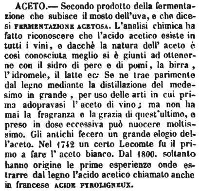 | Aceto - Secondo prodotto della fermentazione che subisce il mosto dell'uva, e che dicesi fermentazione acetosa. L'analisi chimica ha fatto riconoscere che l'acido acetico esiste in tutti i vini, e dacchè la natura dell'aceto è così conosciuta meglio si è giunti ad ottenerne con il sidro di pere e di pomi, la birra, l'idromele, il latte ec; Se ne trae parimente dal legno mediante la distillazione del medesimo in grande, per uso delle arti in cui prima adopravasi l'aceto di vino; ma non ha mai la fragranza e la grazia di quest'ultimo, e preso in dose eccessiva può nuocere moltissimo. Gli antichi fecero un grande elogio dell'aceto. Nel 1742 un certo Lecomte fu il primo a fare l'aceto bianco. Dal 1800. soltanto hanno origine le prime esperienze onde estrarre dal legno l'acido acetico chiamato anche in francese acide pyroligneux. [immagine] |