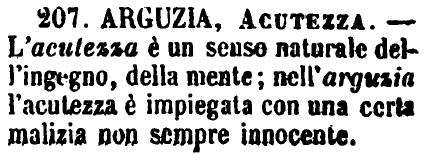 | Arguzia, Acutezza - L'acutezza è un senso naturale dell'ingegno, della mente; nell'arguzia l'acutezza è impiegata con una certa malizia non sempre innocente. [immagine] |