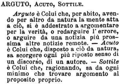 Arguto, Acuto, Sottile - Arguto è Colui che, per abito, avendo per altro da natura la mente atta a ciò, si è addestrato a argomentare per la verità, o redarguire l'errore, o arguire da una notizia più prossima altre notizie remote. - Acuto è Colui che, disposto a ciò da natura, sa scorgere ogni più riposto senso di un discorso, di un autore. - Sottile è Colui che, ragionando, sa da ogni minimo che trovare argomento al proposito proprio. [immagine]