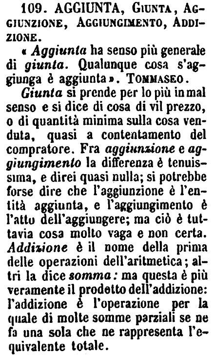 Giunta si prende per lo più in mal senso e si dice di cosa di vil prezzo, o di quantità minima sulla cosa venduta, quasi a contentamento del compratore. Fra aggiunzione e aggiungimento la differenza è tenuissima, e direi quasi nulla; si potrebbe forse dire che l'aggiunzione è l'entità aggiunta, e l'aggiungimento è l'atto dell'aggiungere; ma ciò è tuttavia cosa molto vaga e non certa. Addizione è il nome della prima delle operazioni dell'aritmetica; altri la dice somma: ma questa è più veramente il prodotto dell'addizione: l'addizione è l'operazione per la quale di molte somme parziali se ne fa una sola che ne rappresenta l'equivalente totale. [immagine] |