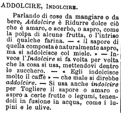 Addolcire, Indolcire - Parlando di cose da mangiare o da bere, Addolcire è Ridurre dolce ciò che è amaro, o acerbo, o aspro, come la polpa di alcune frutta, o l'intriso di qualche farina. - «Il sapore di quella composta è naturalmente aspro, ma si addolcisce col miele.» - Invece l'Indolcire si fa volta per volta che la cosa si usa, mettendovi dentro lo zucchero. - «Egli indolcisce molto il caffè» - che male si direbbe addolcire. - Si usa anche indolcire per Togliere il sapore o amaro o aspro a certe frutte o legumi, tenendoli in fusione in acqua, come i lupini e le ulive. [immagine]