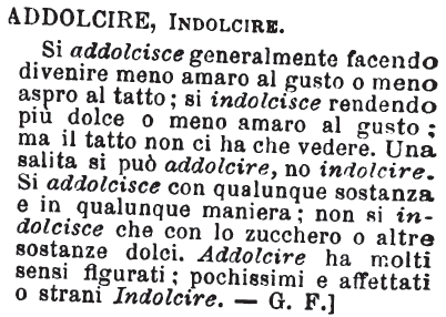 Addolcire, Indolcire - Si addolcisce generalmente facendo divenire meno amaro al gusto o meno aspro al tatto; si indolcisce rendendo più dolce o meno amaro al gusto; ma il tatto non ci ha che vedere. Una salita si può addolcire, no indolcire. Si addolcisce con qualunque sostanza e in qualunque maniera; non si indolcisce che con lo zucchero o altre sostanze dolci. Addolcire ha molti sensi figurati; pochissimi e affettati o strani Indolcire. - G. F.] [immagine]