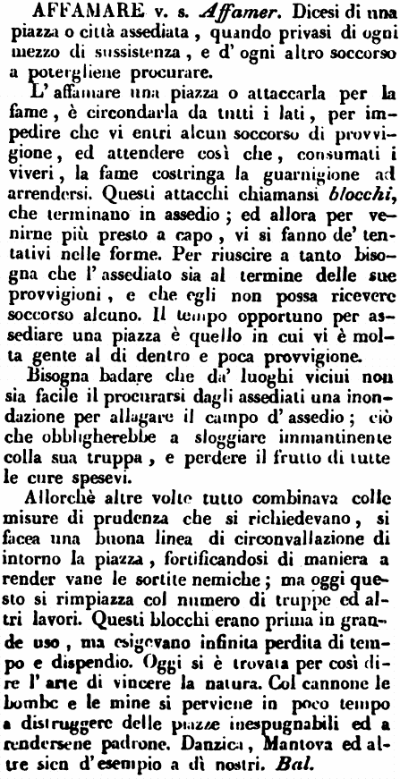 | Affamare - v. s. Affamer. Dicesi di una piazza o città assediata, quando privasi di ogni mezzo di sussistenza, e d'ogni altro soccorso a potergliene procurare.