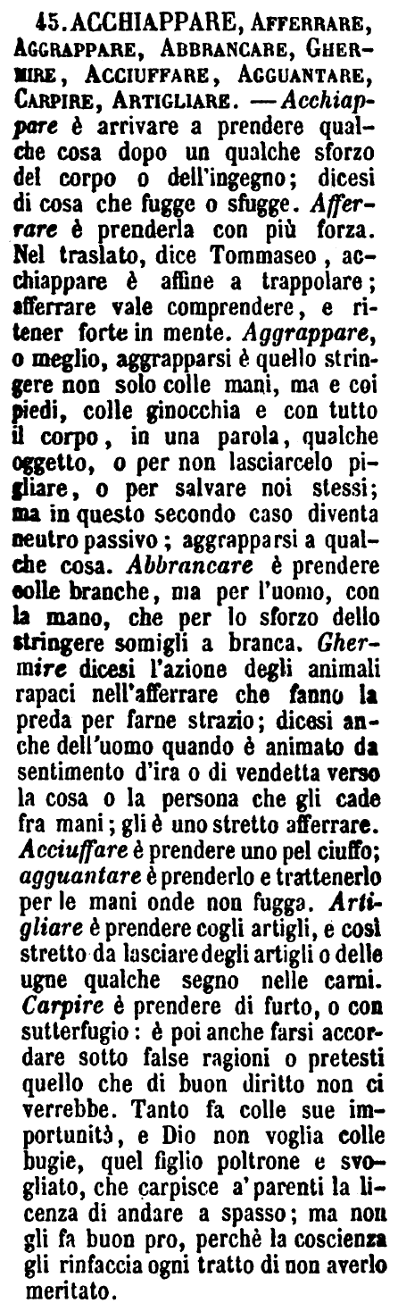 Acchiappare, Afferrare, Aggrappare, Abbrancare, Ghermire, Acciuffare, Agguantare, Carpire, Artigliare - Acchiappare è arrivare a prendere qualche cosa dopo un qualche sforzo del corpo o dell'ingegno; dicesi di cosa che fugge o sfugge. Afferrare è prenderla con più forza. Nel traslato, dice Tommaseo, acchiappare è affine a trappolare; afferrare vale comprendere, e ritener forte in mente. Aggrappare, o meglio, aggrapparsi è quello stringere non solo colle mani, ma e coi piedi, colle ginocchia e con tutto il corpo, in una parola, qualche oggetto, o per non lasciarcelo pigliare, o per salvare noi stessi; ma in questo secondo caso diventa neutro passivo; aggrapparsi a qualche cosa. Abbrancare è prendere colle branche, ma per l'uomo, con la mano, che per lo sforzo dello stringere somigli a branca. Ghermire dicesi l'azione degli animali rapaci nell'afferrare che fanno la preda per farne strazio; dicesi anche dell'uomo quando è animato da sentimento d'ira o di vendetta verso la cosa o la persona che gli cade fra mani; gli è uno stretto afferrare. Acciuffare è prendere uno pel ciuffo; agguantare è prenderlo e trattenerlo per le mani onde non fugga. Artigliare è prendere cogli artigli, e così stretto da lasciare degli artigli o delle ugne qualche segno nelle carni. Carpire è prendere di furto, o con sutterfugio: e poi anche farsi accordare sotto false ragioni o pretesti quello che di buon diritto non ci verrebbe. Tanto fa colle sue importunità, e Dio non voglia colle bugie, quel figlio poltrone e svogliato, che carpisce a' parenti la licenza di andare a spasso; ma non gli fa buon pro, perchè la coscienza gli rinfaccia ogni tratto di non averlo meritato. [immagine]