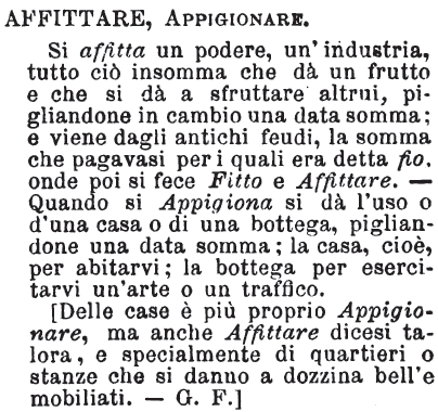 | Affittare, Appigionare - Si affitta un podere, un'industria, tutto ciò insomma che dà un frutto e che si dà a sfruttare altrui, pigliandone in cambio una data somma; e vien dagli antichi feudi, la somma che pagavasi per i quali era detta fio, onde poi si fece Fitto e Affittare. - Quando si Appigiona si dà l'uso o d'una casa o di una bottega, pigliandone una data somma; la casa, cioè, per abitarvi; la bottega per esercitarvi un'arte o un traffico.
