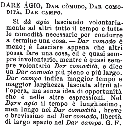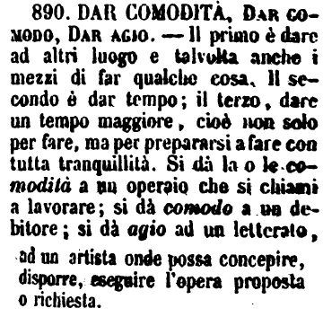 Dar comodità, Dar comodo, Dar agio - Il primo è dare ad altri luogo e talvolta anche i mezzi di far qualche cosa. Il secondo è dar tempo; il terzo, dare un tempo maggiore, cioè non solo per fare, ma per prepararsi a fare con tutta tranquillità. Si dà la o le comodità a un operaio che si chiami a lavorare; si dà comodo a un debitore; si dà agio ad un letterato, ad un artista onde possa concepire, disporre, eseguire l'opera proposta o richiesta. [immagine]