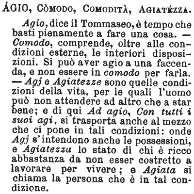 Agio, Comodo, Comodità, Agiatezza - Agio, dice il Tommaseo, è tempo che basti pienamente a fare una cosa. - Comodo, comprende, oltre alle condizioni esterne, le interiori disposizioni. Si può aver agio a una faccenda, e non essere in comodo per farla. - Agj e Agiatezze sono quelle condizioni della vita, per le quali l'uomo può non attendere ad altro che a star bene; e di qui Ad agio, Con tutti i suoi agi, si trasporta anche al mezzo che ci pone in tali condizioni: onde Agj s'intendono anche le possessioni, e Agiatezza lo stato di chi è ricco abbastanza da non esser costretto a lavorare per vivere; e Agiata si chiama la persona che è in tal condizione. [immagine]