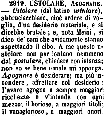 | Ustolare, Agognare - Ustolare (dal latino ustulare), abbruciacchiare, cioè ardere di voglia, d'un desiderio materiale, e si direbbe brutale; e, nota Meini, si dice de' cani che avidamente stanno aspettando il cibo. A me questo ustolare non par lontano nemmeno dal postulare, chiedere con istanza; non so se bene o male mi apponga. Agognare è desiderare; ma più intendere, affrettare col desiderio: l'avaro agogna a sempre maggiori ricchezze e v'intende con ogni mezzo; il borioso, a maggiori titoli; il vanaglorioso, a maggiori onori. [immagine] |