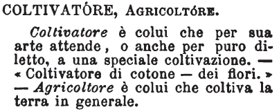 Coltivatore, Agricoltore - Coltivatore è colui che per sua arte attende, o anche per puro diletto, ad una speciale coltivazione. - « Coltivatore di cotone - dei fiori.» - Agricoltore è colui che coltiva la terra in generale. [immagine]