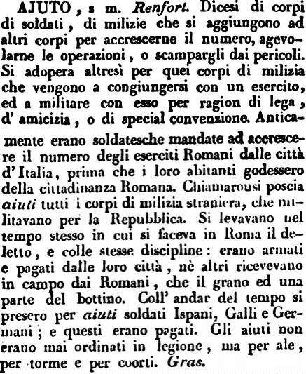 Ajuto - s. m. Renfort. Dicesi di corpi di soldati, di milizie che si aggiungono ad altri corpi per accrescerne il numero, agevolarne le operazioni, o scampargli dai pericoli. Si adopera altresì per quei corpi di milizia che vengono a congiungersi con un esercito, ed a militare con esso per ragion di lega, d'amicizia, o di special convenzione. Anticamente erano soldatesche mandate ad accrescere il numero degli eserciti Romani dalle città d'Italia, prima che i loro abitanti godessero della cittadinanza Romana. Chiamaronsi poscia aiuti tutti i corpi di milizia straniera, che militavano per la Repubblica. Si levavano nel tempo stesso in cui si faceva in Roma il deletto, e colle stesse discipline: erano armati e pagati dalle loro città, nè altri ricevevano in campo dai Romani, che il grano ed una parte del bottino. Coll'andar del tempo si presero per aiuti soldati Ispani, Galli e Germani; e questi erano pagati. Gli aiuti non erano mai ordinati in legione, ma per ale, per torme e per coorti. Gras. [immagine]