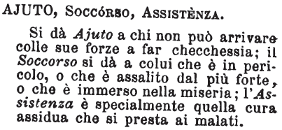 Ajuto, Soccorso, Assistenza - Si dà Ajuto a chi non può arrivare colle sue forze a far checchessia; il Soccorso si dà a colui che è in pericolo, o che è assalito dal più forte, o che è immerso nella miseria; l'Assistenza è specialmente quella cura assidua che si presta ai malati. [immagine]