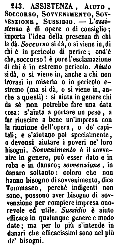 Assistenza, Aiuto, Soccorso, Sovvenimento, Sovvenzione, Sussidio - L'assistenza è di opere o di consiglio; importa l'idea della presenza di chi la dà. Soccorso si dà, o si viene in, di chi è in pericolo di perire; ond'è che, soccorso! è pure l'esclamazione di chi è in estremo pericolo. Aiuto si dà, o si viene in, anche a chi non trovasi in miseria o in pericolo estremo (ma si dà, o si viene in, anche a questi): si aiuta in genere chi da sè non potrebbe fare una data cosa: s'aiuta a portare un peso, a far riuscire a bene un'impresa con la riunione dell'opera, o de' capitali; e s'aiutano poi specialmente, o devonsi aiutare i poveri ne' loro bisogni. Sovvenimento è il sovvenire in genere, può esser dato e in roba e in danaro; sovvenzione, in danaro soltanto: coloro che non hanno bisogno di sovvenimento, dice Tommaseo, perchè indigenti non sono, possono aver bisogno di sovvenzione per compiere impresa onorevole ed utile. Sussidio è aiuto efficace in qualunque genere e modo dato; ma per lo più s'intende in danari che efficacissimi sono nel più de' bisogni. [immagine]
