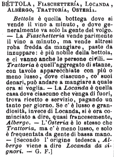 | Bettola, Fiaschetteria, Locanda, Albergo, Trattoria, Osteria - Bettola è quella bottega dove si vende il vino a minuto, e dove generalmente va solo la gente del volgo. - La Fiaschetteria vende parimente il vino a minuto, ma vende altresì roba fredda da mangiare, paste da inzuppare: è più nobile della bettola, e ci vanno anche le persone civili. - Trattoria è quell'aggregato di stanze, con tavole apparecchiate con più o meno lusso, dove ciascuno, co' suoi denari, può andare a mangiare a quale ora si voglia. - La Locanda è quella casa dove ciascuno che venga di fuori, trova ricetto e servizio, pagando un tanto per giorno. Se c'è lusso e grandiosità, invece di Locanda, si è ora cominciato a dire, quasi francesemente, Albergo. - L'Osteria è lo stesso che Trattoria, ma c'è meno lusso, e solo è frequentata da gente di bassa mano. - [Secondo l'origine tedesca, Albergo viene a dire Locanda da signori. - G.F.] [immagine] |