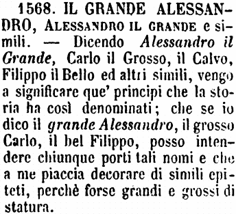 | Il grande Alessandro, Alessandro il grande e simili - Dicendo Alessandro il Grande, Carlo il Grosso, il Calvo, Filippo il Bello ed altri simili, vengo a significare que' principi che la storia ha così denominati; che se io dico il grande Alessandro, il grosso Carlo, il bel Filippo, posso intendere chiunque porti tali nomi e che a me piaccia decorare di simili epiteti, perché forse grandi e grossi di statura. [immagine] |