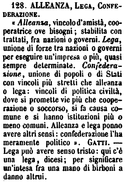 | Alleanza, Lega, Confederazione - «Alleanza, vincolo d'amistà, cooperatrice ove bisogni; stabilita con trattati, fra nazioni o governi. Lega, unione di forze tra nazioni o governi per eseguire un'impresa o più, quasi sempre determinate. Confederazione, unione di popoli o di Stati con vincoli più stretti che alleanza o lega: vincoli di politica civiltà, dove si promette vie più che cooperazione o soccorso, si fa causa comune e si hanno istituzioni più o meno comuni. Alleanza e lega ponno avere altri sensi: confederazione l'ha meramente politico». Gatti. - Lega può avere senso tristo: qui c'è una lega, dicesi; per significare un'intesa fra una mano di birboni a danno altrui. [immagine] |