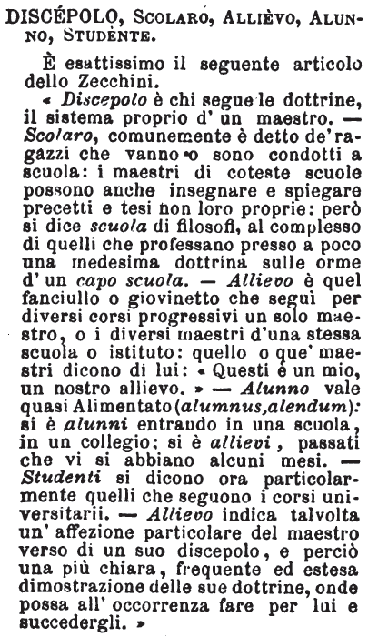 | Discepolo, Scolaro, Allievo, Alunno, Studente - È esattissimo il seguente articolo dello Zecchini.