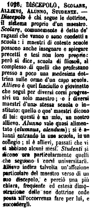 « Discepolo è chi segue le dottrine, il sistema proprio d'un maestro. - Scolaro, comunemente è detto de' ragazzi che vanno o sono condotti a scuola: i maestri di coteste scuole possono anche insegnare e spiegare precetti e tesi non loro proprie: però si dice scuola di filosofi, al complesso di quelli che professano presso a poco una medesima dottrina sulle orme d'un capo scuola. - Allievo è quel fanciullo o giovinetto che seguì per diversi corsi progressivi un solo maestro, o i diversi maestri d'una stessa scuola o istituto: quello o que' maestri dicono di lui: « Questi è un mio, un nostro allievo. » - Alunno vale quasi Alimentato (alumnus, alendum): si è alunni entrando in una scuola, in un collegio: si è allievi, passati che vi si abbiano alcuni mesi. - Studenti si dicono ora particolarmente quelli che seguono i corsi universitarii. - Allievo indica talvolta un'affezione particolare del maestro verso di un suo discepolo, e perciò una più chiara, frequente ed estesa dimostrazione delle sue dottrine, onde possa all'occorrenza fare per lui e succedergli. » [immagine] |