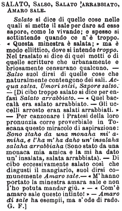 | Salato, Salso, Salato arrabbiato, Amaro sale - Salato si dice di quelle cose nelle quali si mette il sale per dare ad esse sapore, come le vivande; e spesso si sottintende quando ce n'è troppo. «Questa minestra è salata;» ma è modo ellittico, dove si intende troppo. Nel traslato si dice di quei motti o di quelle scritture che urbanamente e briosamente censurano qualcuno. - Salso suol dirsi di quelle cose che naturalmente contengono dei sali. Acqua salsa, Umori salsi. Sapore salso. - [Di cibo troppo salato si dice per enfasi Salato arrabbiato. - «Quel baccalà era salato arrabbiato. - Gli uccelli arrosto eran salati arrabbiati.» - Per canzonare i Pratesi della loro pronunzia corre proverbiale in Toscana questo miracolo di aspirazione: Sono staho da una monaha mi' amiha, e l'ha m'ha daho un'insalaha salaha arrabbiaha (Sono stato da una monaca mia amica e la mi ha dato un'insalata, salata arrabbiata). - Di cibo eccessivamente salato così che disgusti il mangiarlo, suol dirsi comunemente Amaro sale. - «M'hanno portato la minestra amara sale e non l'ho potuta mandar giù.» - «Com'è amaro sale questo intinto!» - Amaro di sale ha esempii, ma s'ode di rado. G. F.] [immagine] |